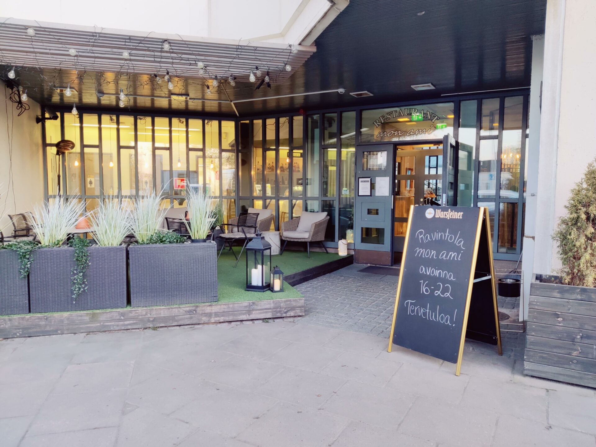 Ravintola mon ami tarjoilee laadukkaita ala carte -annoksia Haminan keskustassa iltaisin ja viikonloppuisin. Terassilla voit nautiskella vaikkapa kylmää, pirskahtelevaa roseeviiniä, cocktaileja ja mocktaile tai kirsikka-suklaajäätelöä.