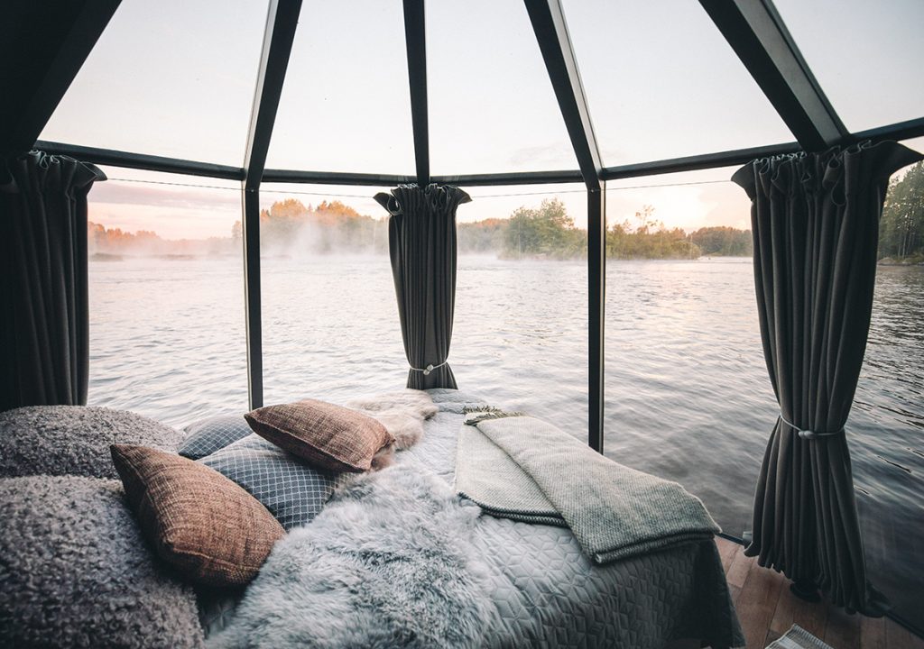 Aurora Hutin lasiseinät ja -katto mahdollistavat niin jokimaiseman, poutapilvien kuin tähtitaivaankin ihailun suoraan sängystä. Joen päällä kelluvassa Aurora Hutissa on parivuode, WC, jääkaappi ja pieni keittiötila sekä terassi.