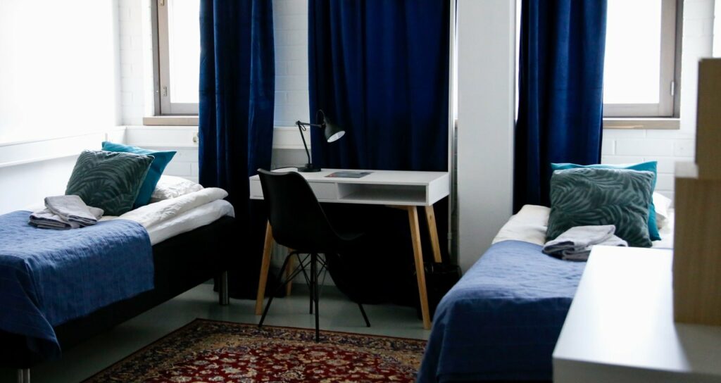 THE Hotel har flera dubbelrum. De flesta rummen (50 st.) är 10–20 kvadratmeter stora enkelrum. Samtliga rum är utrustade med WiFi, högklassiga sängar med sängkläder, garderob och skrivbord med stol. De större rummen har ett eget badrum och de mindre rummen har tillgång till ett delat badrum och delad toalett. THE Hotel vill vara ditt hem när du är ute på äventyr, ”your home away from home”.